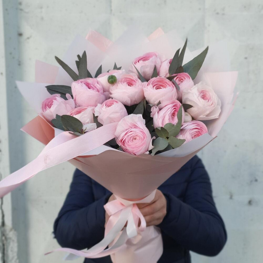 На фото букет из 15 розовых ранункулюсов. В составе: ранункулюс 15 шт, эвкалипт 2 шт, дизайнерская упаковка 1 шт, атласная лента 1 шт, . Все цветы свежие и ароматные, букет красиво оформлен и отлично подходит для подарка. Доступна доставка цветов или самовывоз.