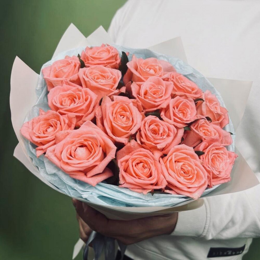 На фото букет из 17 коралловых роз. В составе: роза 17 шт, дизайнерская упаковка 2 шт, атласная лента 1 шт, . Все цветы свежие и ароматные, букет красиво оформлен и отлично подходит для подарка. Доступна доставка цветов или самовывоз.