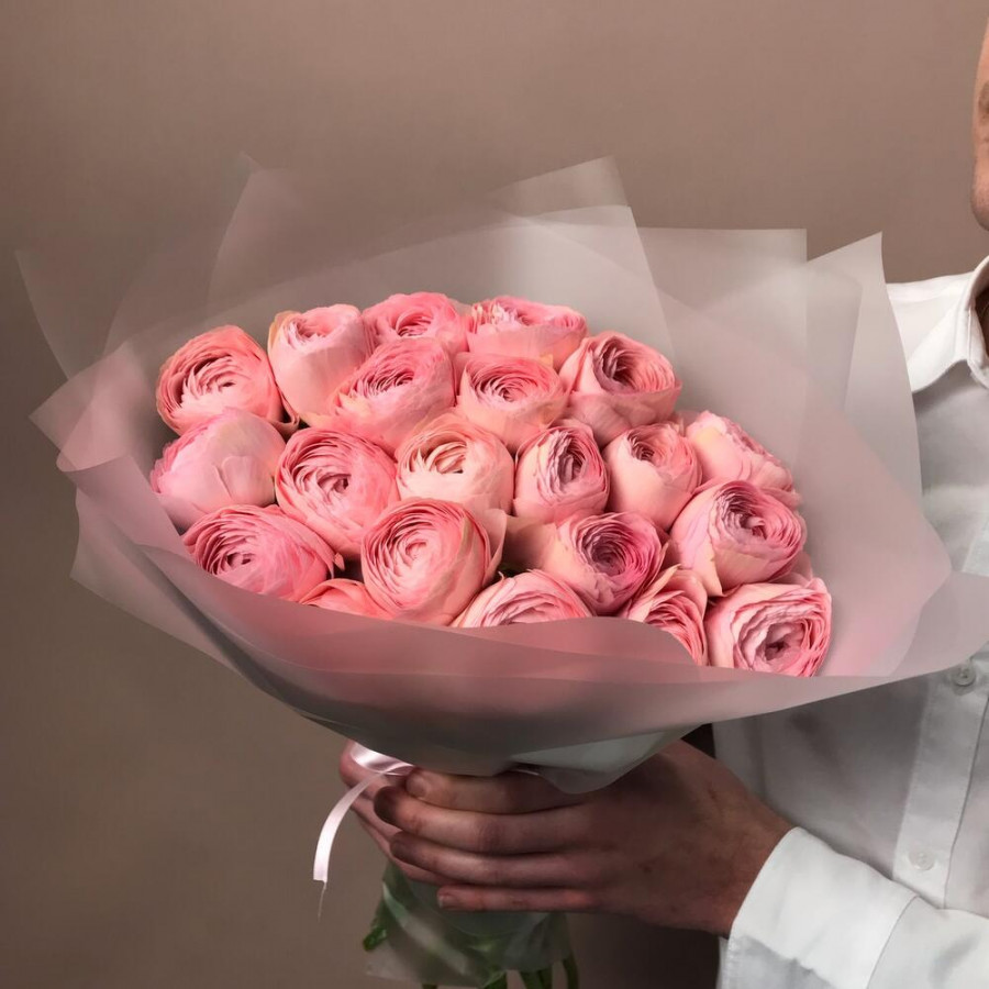 На фото букет: 21 розовый ранункулюс. В составе: ранункулюс 21 шт, дизайнерская упаковка 1 шт, атласная лента 1 шт, . Все цветы свежие и ароматные, букет красиво оформлен и отлично подходит для подарка. Доступна доставка цветов или самовывоз.