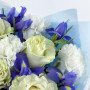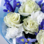Букет из белых гвоздик, синих ирисов и белых роз в Черняховске