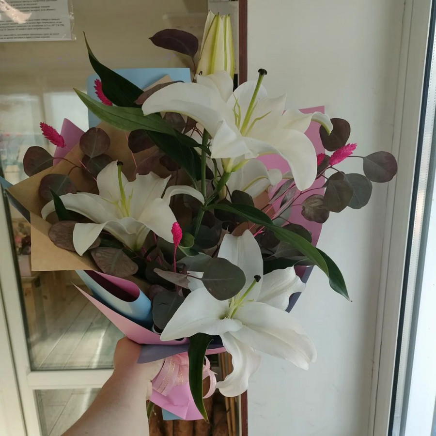 Букет из одной лилии и нескольких эвкалиптовых веточек - это изысканный и оригинальный подарок для тех, кто ценит качество и стиль. Лилия символизирует красоту и благородство, а эвкалипт - свежесть и чистоту, что создает неповторимый образ букета. Такой подарок подчеркнет ваш тонкий вкус и внимание к мелочам.