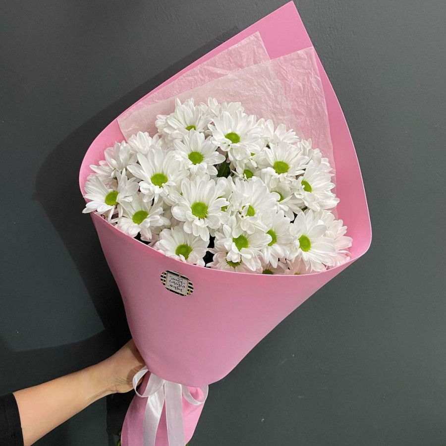 На фото букет из 5 белых кустовых хризантем. В составе: хризантема кустовая 5 шт, крафт-бумага 1 шт, . Все цветы свежие и ароматные, букет красиво оформлен и отлично подходит для подарка. Доступна доставка цветов или самовывоз.