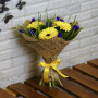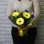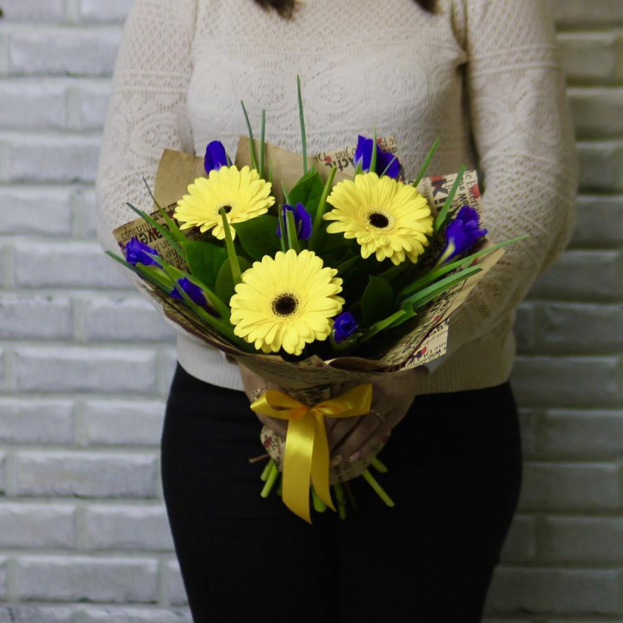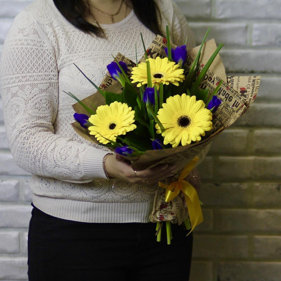Букет из желтых гербер с синими ирисами в Черняховске