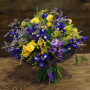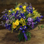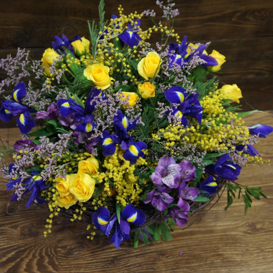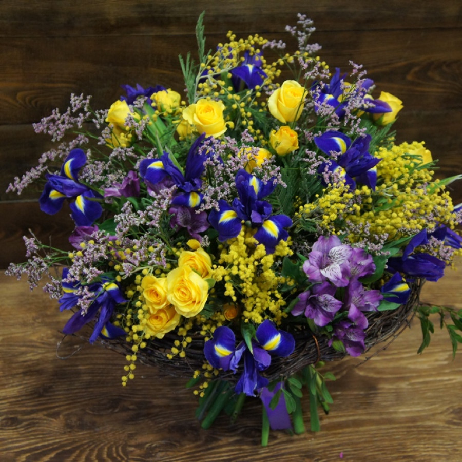 Одиннадцать свежайших ирисов, яркие и симпатичные веточки лимониума, ароматнейшие кустовые розы, вкрапления мимозы, нежнейшие лепестки альстромерии и вечно зеленые листочки папоротника – такая композиция действительно задает превосходное настроение, вызывает счастливый блеск в глазах и улыбку. Композиция декорирована лентой, что позволяет в полную меру наслаждаться красотой цветов, а не упаковки.
