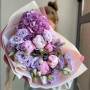 На фото букет из пионов и фиолетовой гортензии. В составе: гортензия 1 шт, пион 5 шт, эустома (лизиантус) 5 шт, озотамнус 1 шт, крафт-бумага 0 шт, . Все цветы свежие и ароматные, букет красиво оформлен и отлично подходит для подарка. Доступна доставка цветов или самовывоз.