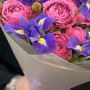 Букет из розовых пионовидных роз и синих ирисов в Черняховске