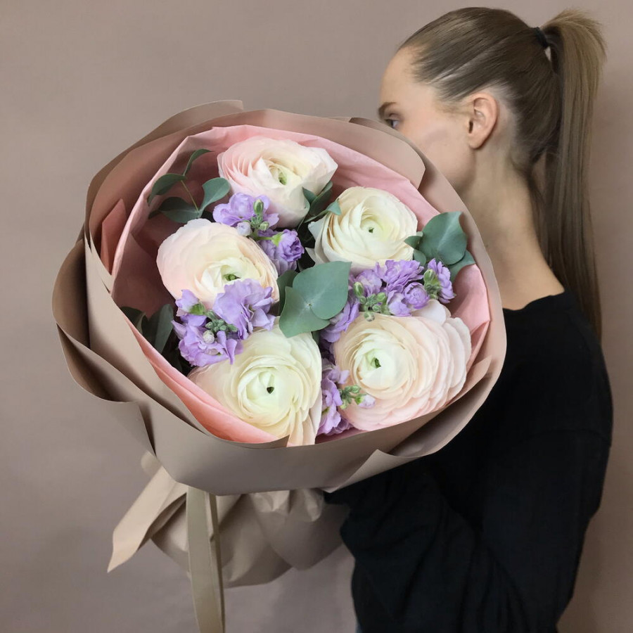 Букет из розовых ранункулюсов и сиреневой матиолы в Черняховске
