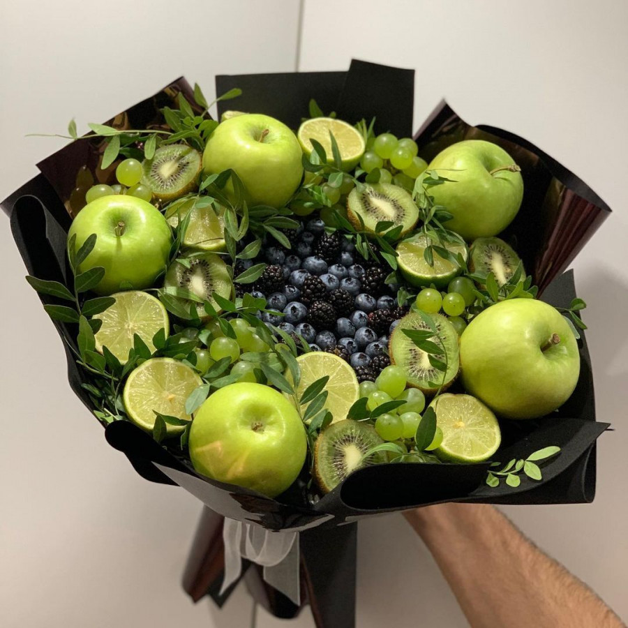 На фото букет с черникой. В составе: черника 1 шт, ежевика 1 шт, виноград (зеленый) 1 шт, лайм 3 шт, киви 3 шт, яблоко 5 шт, писташ 2 шт, крафт-бумага 1 шт, атласная лента 1 шт, . Все цветы свежие и ароматные, букет красиво оформлен и отлично подходит для подарка. Доступна доставка цветов или самовывоз.