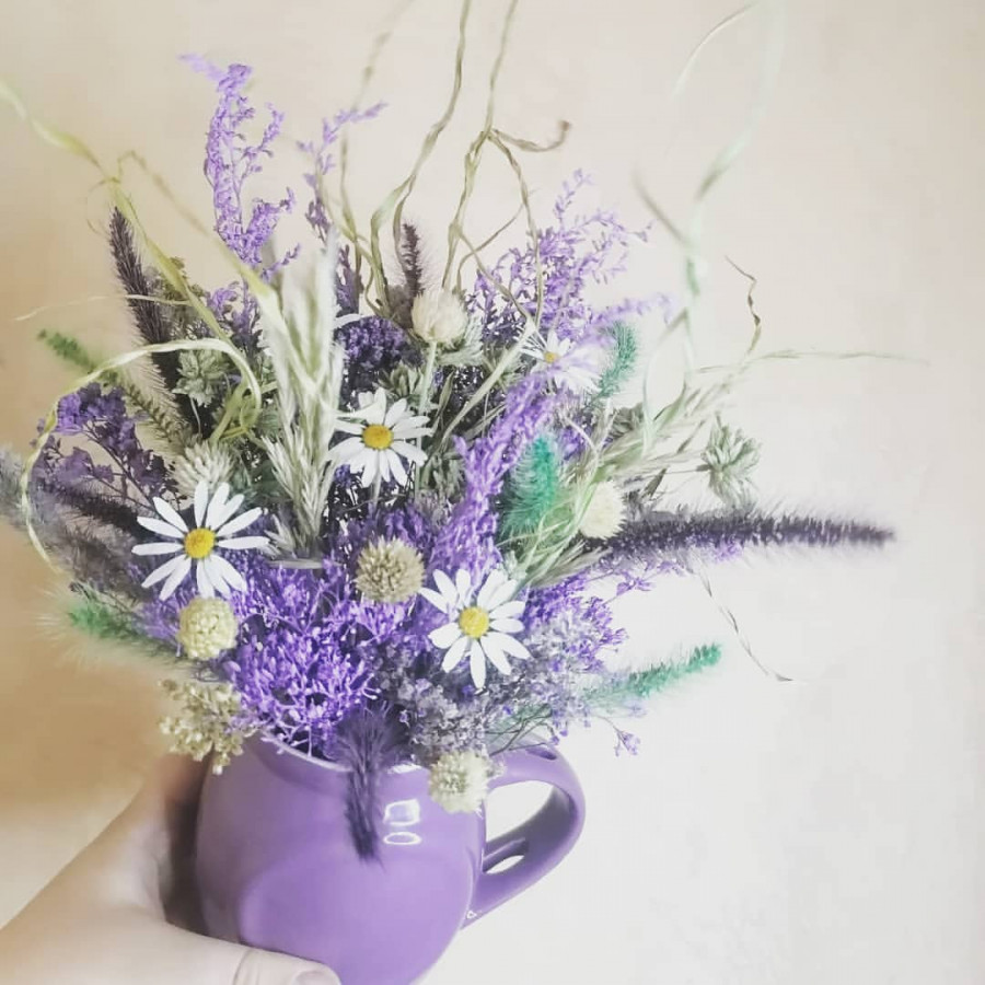 На фото композиция из сухоцветов и ромашки. В составе: лаванда 2 шт, ромашки 1 шт, сухоцветы (микс) 2 шт, коробка (s) 1 шт, . Все цветы свежие и ароматные, букет красиво оформлен и отлично подходит для подарка. Доступна доставка цветов или самовывоз.